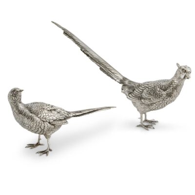 Stunning hallmarked silver pheasants, showing a cock and hen in realistic poses, make a wonderful addition to any dining room. The quality of these pieces is second to none, with each item being hand made to the finest of standards, and the combined weight of the pieces being over 60ozs of sterling silver. The birds have been hand cast using the lost wax method, meaning the full weight of the model is sterling silver. Each item has then been chased by hand to create beautiful detailing throughout, before being meticulously polished. These wonderful pheasants are supplied in individual presentation boxes. To prevent the silver from tarnishing, we recommend a regular clean with an impregnated cloth – or alternatively use a soft cloth and a good quality silver polish.