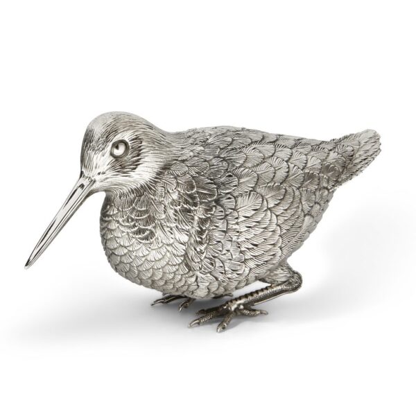 This realistically modelled silver woodcock would make a wonderful gift. Hand cast, and then chased by hand to create intricate feathered detailing, the quality of this piece is second to none. Like all our models, our woodcock has not been filled to create an artificial weight, and is around 9 ozs of ‘all sterling silver’. The piece would make the perfect table ornament, and is supplied in one of our signature gift boxes. To prevent the silver from tarnishing, we recommend a regular clean with an impregnated cloth – or alternatively use a soft cloth and a good quality silver polish.
