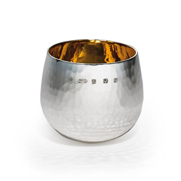 Our brandy tumbler is made in hallmarked Britannia silver, and is, without doubt, one of the finest quality pieces we make. This piece is made from super heavy silver and is completely handmade, with a hand ‘planished’ effect created by Sheffield’s last apprentice-trained hammerman. The tumbler cup has a gorgeous polished finish to the exterior and a rich gold gilt polished interior. The tumbler feels incredible in the hand, weighing around 9oz of silver. This item is often bought to commemorate a memorable event in the recipient’s life, and we have also supplied the piece in larger quantities. Each tumbler is presented in our luxurious gift boxes. For maintenance purposes, the cup should be cleaned after use with hot soapy water and a soft cloth. To prevent the silver from tarnishing, we recommend a regular clean with an impregnated silver cloth.