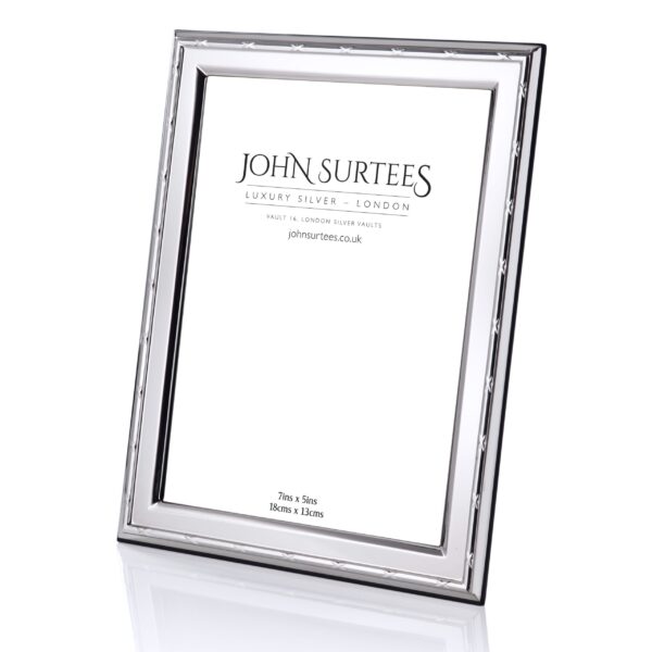 Our Canterbury frame has a gorgeous “Reed and Ribbon” detail around the perimeter. This touch of detailing gives the design a regal look. The 1.8cm band width frame is hand made from sterling silver and is hallmarked. The Canterbury is available in a number of sizes and can stand either portrait or landscape, depending on the photo you would like to insert. It has an engineered black wood back and is presented in a black gift box. The frame should be cleaned occasionally with a soft cloth and a recommended silver polish, or alternatively an impregnated silver cloth.