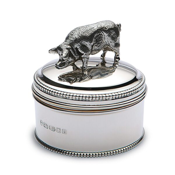 This pig box is a fun piece made to an incredible standard. Featuring a smart pig made in silver and soldered to the lid, the box is an incredible 4 troy ounces of hallmarked sterling silver. The exterior of the box has beautiful silver polishing and the interior has a rich gold gilt lining. This 6cm diameter box is extremely versatile and relevant to any aged recipient, but particularly a child as this box has been made to last a lifetime. As with all our pieces, this item is presented in a smart box. Keep this item clean with a regular polish with an impregnated silver cloth. Alternatively clean with a recommended silver polish and a soft cloth.