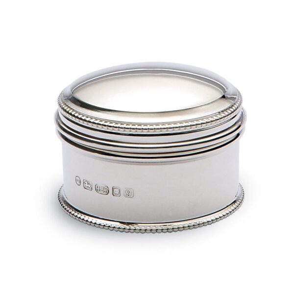 The M096 circular box is the perfect trinket gift for a child. These boxes are unrivalled quality, made in heavy weight hallmarked silver, and each box is gold gilt lined. The boxes have a fine bead decoration which has been applied to the lid and the base. This size is perfect for either a first curl or tooth, and can be used throughout the recipients life to hold precious jewellery items, such as earrings or cufflinks. Each box comes presented in a lovely gift box. We recommend a regular clean with either an impregnated silver cloth, or using a recommended silver polish and a soft cloth.