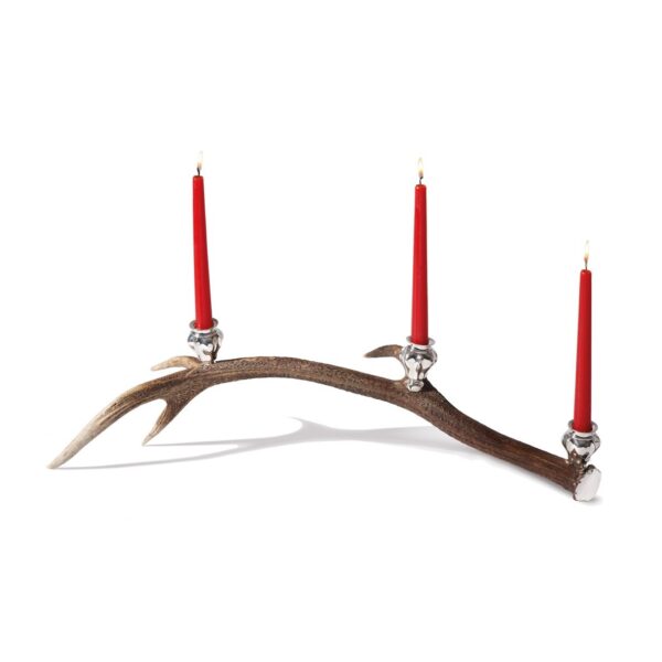 This wonderful stag and silver candelabra is sure to brighten any dining setting. Made with red deer antler, shed in the Scottish Highlands, we have embellished this natural product with 3 sterling silver sconces and a sterling silver end cap. Each piece of stag we purchase is slightly different in colour, length and shape, making each item a truly unique piece. We are proud of all the items we make, but some pieces are ‘extra special’, and this is one which falls into this category. For maintenance purposes, please always consider that the stag is a natural product – do not immerse in water or clean with any chemicals. To prevent the silver sconces from tarnishing, we recommend a regular clean with an impregnated silver cloth.