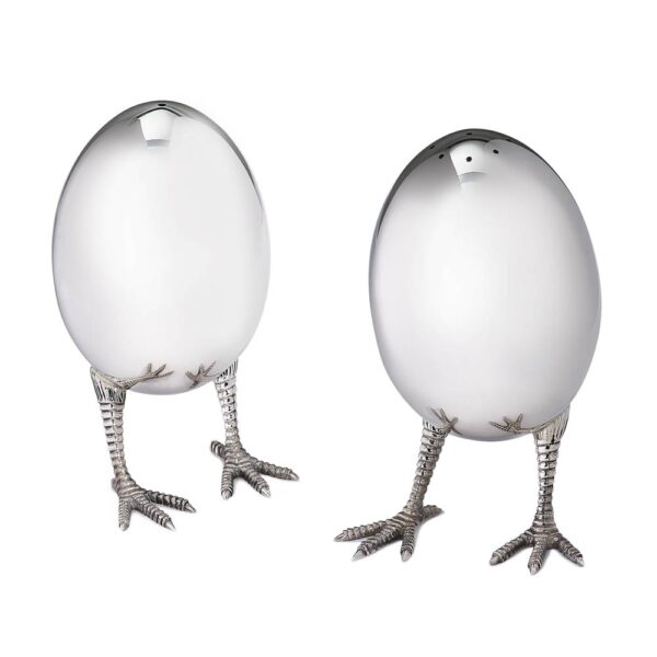 Our amazing ‘Eggs on Legs’ salt and pepper pourers are certain to be a talking point at any dinner party. These items are particularly difficult to make, and the quality and attention to detail of these pieces is exceptional. Made in sterling silver, a beautifully polished egg sits perfectly on two chicken legs, giving the illusion that they are ‘on the run’! A silver screw has been fitted in the base of each piece to enable the filling/removal of the salt or pepper. These items can be engraved, and are supplied in one of our luxury gift boxes. To prevent the silver from tarnishing we recommend a regular clean with an impregnated silver cloth. Salt should not be left in the salt pourer for long periods as it will corrode the silver, and ideally, we recommend filling the pourers up on the day of use.