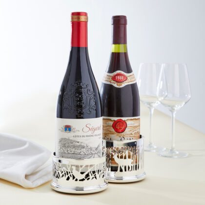 This deep sided hallmarked silver bottle coaster is a truly unique gift, which showcases the finest Sheffield craftsmanship. The coaster is superb quality, and has been designed by James Bailey to commemorate our 150th year in business. The body has a scene of a stag making it’s way through the forest, which has been saw pierced by hand. We believe there are only 2 saw piercers left in the Sheffield trade who are able to do this type of work. The coaster has a 4″ diameter and will hold either wine or champagne bottles, and features an American Black Walnut base. This piece is supplied in one of our luxurious gift boxes. For maintenance purposes, any wine residue should be wiped off with a damp cloth to protect the natural wood. To prevent the silver from tarnishing, we recommend a regular clean with an impregnated silver cloth.