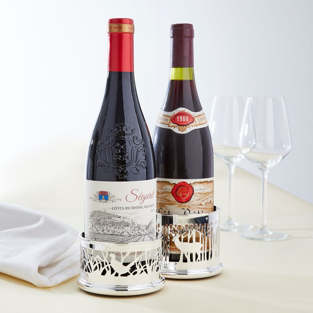 This substantial hallmarked silver bottle coaster is a truly unique gift, which showcases the finest Sheffield craftsmanship. The coaster is superb quality, and has been designed by James Bailey to commemorate our 150th year in business. The body has a saw pierced scene of a pheasant in the reeds which has been crafted by hand. We believe there are only 2 saw piercers left in the Sheffield trade who are able to do this type of work. The coaster has a 4″ diameter and will hold either wine or champagne bottles, and features an American Black Walnut base. This piece is supplied in one of our luxurious gift boxes. For maintenance purposes, any wine residue should be wiped off with a damp cloth to protect the natural wood. To prevent the silver from tarnishing, we recommend a regular clean with an impregnated silver cloth.