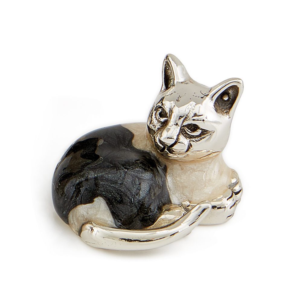 A beautifully crafted family of three black and white cats made in Silver and enamel. Our popular Saturno range consists of a series of exquisitely hand-crafted silver animal models. Using traditional techniques, the models are perfectly formed in high quality sterling silver, with multiple layers of vitreous enamel carefully applied before the models are fired. To prevent tarnishing, a final layer of lacquer is skillfully applied producing a wonderfully authentic finish. These exquisite models have timeless appeal, the perfect gift that is as unusual as it is unique.