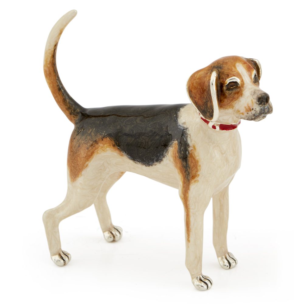 A beautifully crafted english fox hound couple made in Silver and enamel. Our popular Saturno range consists of a series of exquisitely hand-crafted silver animal models. Using traditional techniques, the models are perfectly formed in high quality sterling silver, with multiple layers of vitreous enamel carefully applied before the models are fired. To prevent tarnishing, a final layer of lacquer is skillfully applied producing a wonderfully authentic finish. These exquisite models have timeless appeal, the perfect gift that is as unusual as it is unique. The english fox hound couple form part of our our inspirational collection of models inspired by the natural world.