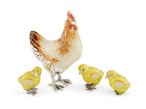A beautifully crafted hen with 3 chicks made in Silver and enamel. Our popular Saturno range consists of a series of exquisitely hand-crafted silver animal models. Using traditional techniques, the models are perfectly formed in high quality sterling silver, with multiple layers of vitreous enamel carefully applied before the models are fired. To prevent tarnishing, a final layer of lacquer is skillfully applied producing a wonderfully authentic finish. These exquisite models have timeless appeal, the perfect gift that is as unusual as it is unique. The hen with 3 chicks form part of our our inspirational collection of models inspired by the natural world.