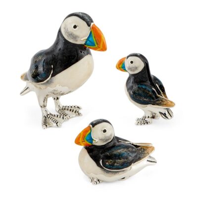 A beautifully crafted family of three puffins made in Silver and enamel. Our popular Saturno range consists of a series of exquisitely hand-crafted silver animal models. Using traditional techniques, the models are perfectly formed in high quality sterling silver, with multiple layers of vitreous enamel carefully applied before the models are fired. To prevent tarnishing, a final layer of lacquer is skillfully applied producing a wonderfully authentic finish. These exquisite models have timeless appeal, the perfect gift that is as unusual as it is unique. The family of three puffins form part of our our inspirational collection of models inspired by the natural world. Please quote ST305 as the general reference for this product for all enquiries.