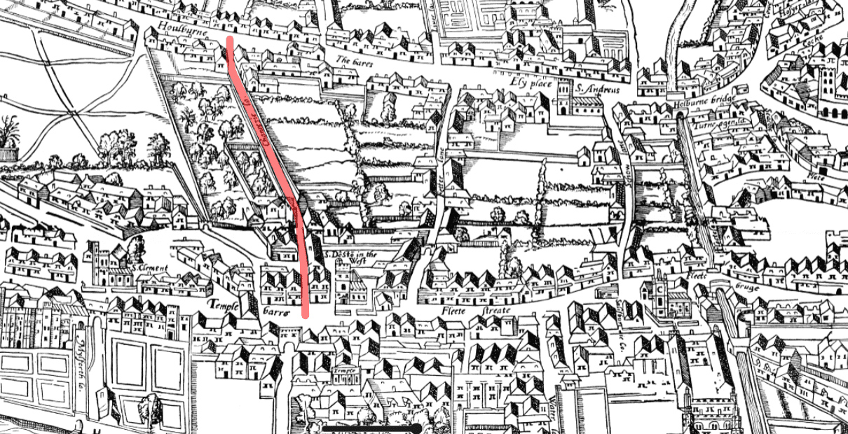 Only 150 years later, in 1676, a subsequent map by Ogilby & Morgan shows the rapid evolution of Chancery Lane into a sophisticated legal mini metropolis, still on exactly the same street lines.