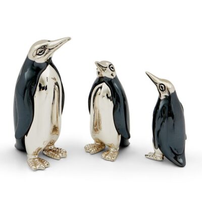 A beautifully crafted family of three penguins oxidised made in Silver and enamel. Our popular Saturno range consists of a series of exquisitely hand-crafted silver animal models. Using traditional techniques, the models are perfectly formed in high quality sterling silver, with multiple layers of vitreous enamel carefully applied before the models are fired. To prevent tarnishing, a final layer of lacquer is skillfully applied producing a wonderfully authentic finish. These exquisite models have timeless appeal, the perfect gift that is as unusual as it is unique. The family of three penguins oxidised form part of our our inspirational collection of models inspired by the natural world. Please quote SM254 as the general reference for this product for all enquiries.