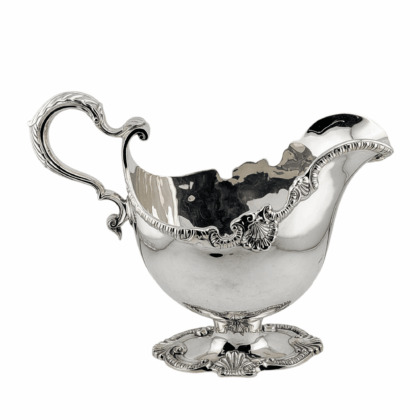 These exceptional antique sterling silver sauce boats are of oval form in…