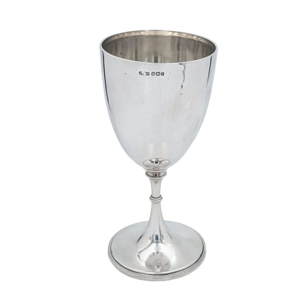 This exquisite Sheffield 1898 sterling silver goblet is a timeless classic. Crafted with utmost precision, it features a simple yet elegant design that adds a touch of sophistication to any table setting. Perfect for enjoying your favorite wine, this goblet showcases the beauty of sterling silver with its lustrous finish. Whether used for special occasions or as a cherished heirloom, this wine goblet is sure to impress.