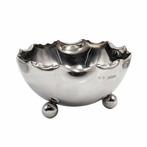 Antique silver bowl from London 1883 with three ball legs and intricate detailing.