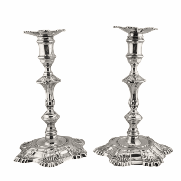 These exceptional mid-eighteenth-century antique cast George II sterling silver, have shaped six shell bases with conforming shaped detachable nozzles. Each capital is fitted with the original hallmarked push-fit sconce, accented with shell decoration to the corners. The upper portion of the waisted-shaped column features a paneled quatrefoil-shaped knop embellished with lobed shell designs. Each paneled column is further ornamented with a plain circular knop to the lower portion. These antique Georgian silver candlesticks are cast and do not have weighted bases. Dimensions, height 8.5 inches, 21.6 cm. Weight, 36 troy oz.