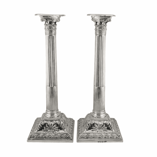 A pair of antique silver George III candlesticks with corinthian columns, acanthus capitals and bead edge, detachable gadroon nozzles. The bases have a shell decoration. These candlesticks are in very good condition and, unlike most candlesticks of this type, the bases are unfilled. They are nicely pierced at the top of the capital. Dimensions: height 31.11 cm