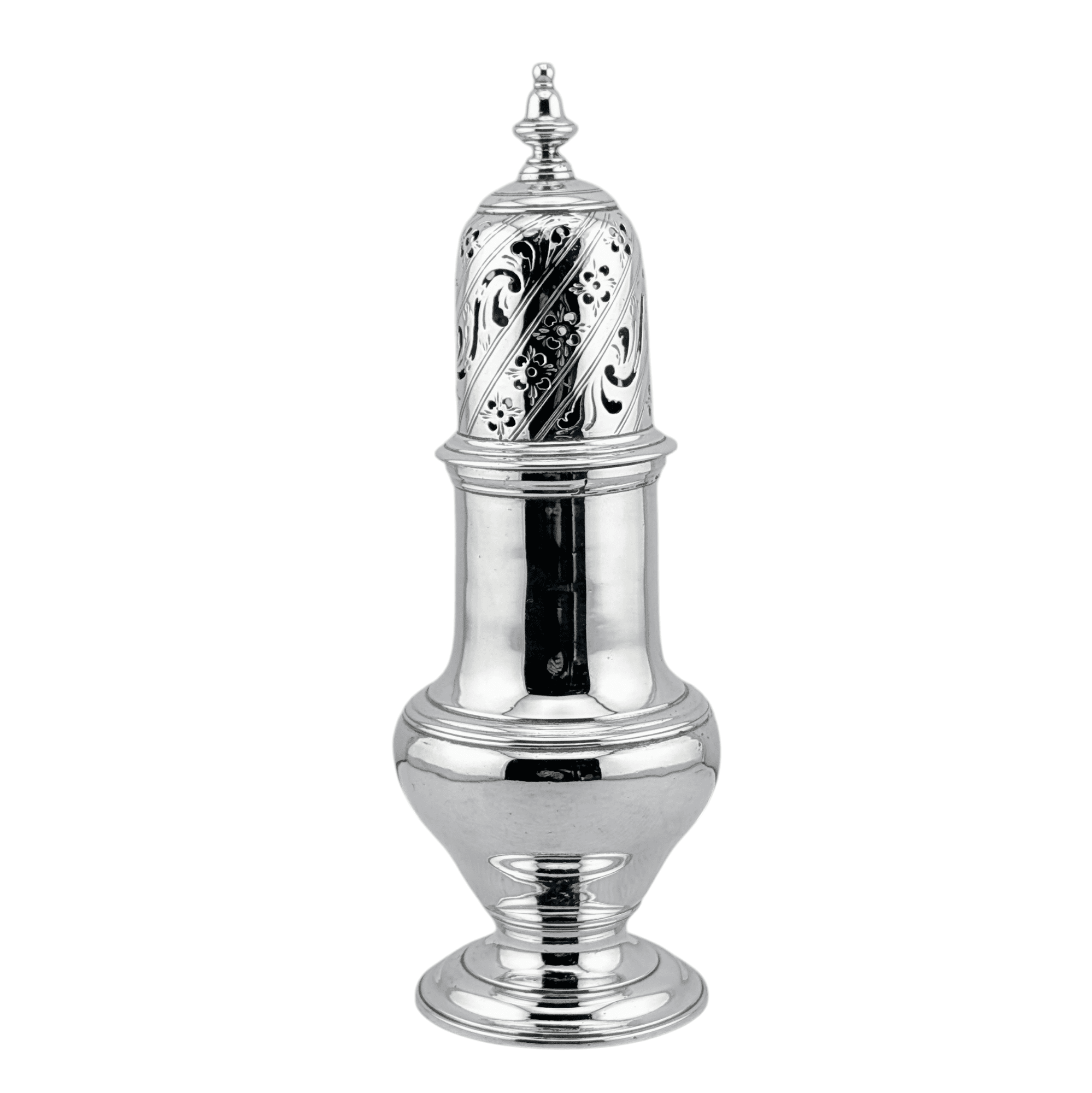 A lovely antique silver sugar caster with a very attractive piercing to the lid. It is nicely hallmarked on the base and correctly part-marked on the lid. On one side of the caster, there is an engraved initial “D” which it is believed pertains to Admiral Sir James Douglas 1703 – 1787 who was commodore of Newfoundland, and amongst other actions served as a member of Admiral Byngs’ court martial in 1757. He owned sugar plantations from 1762 in Guyana and from 1778 in Antigua.