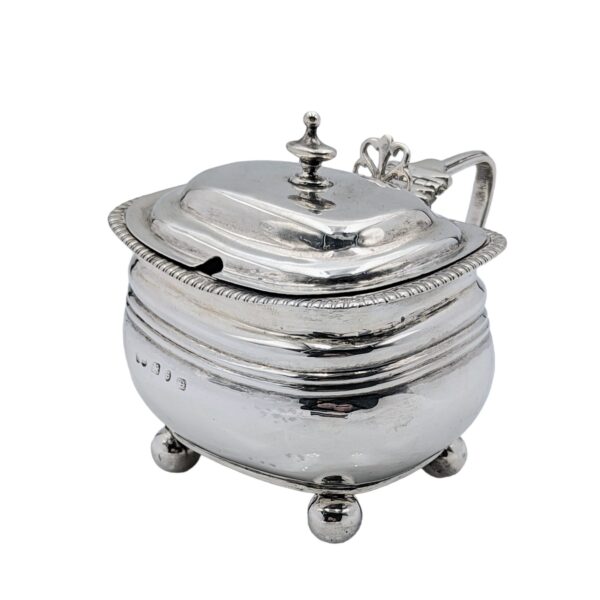 Mustard with spoon, blue glass, 4 ball legs – Birmingham 1892