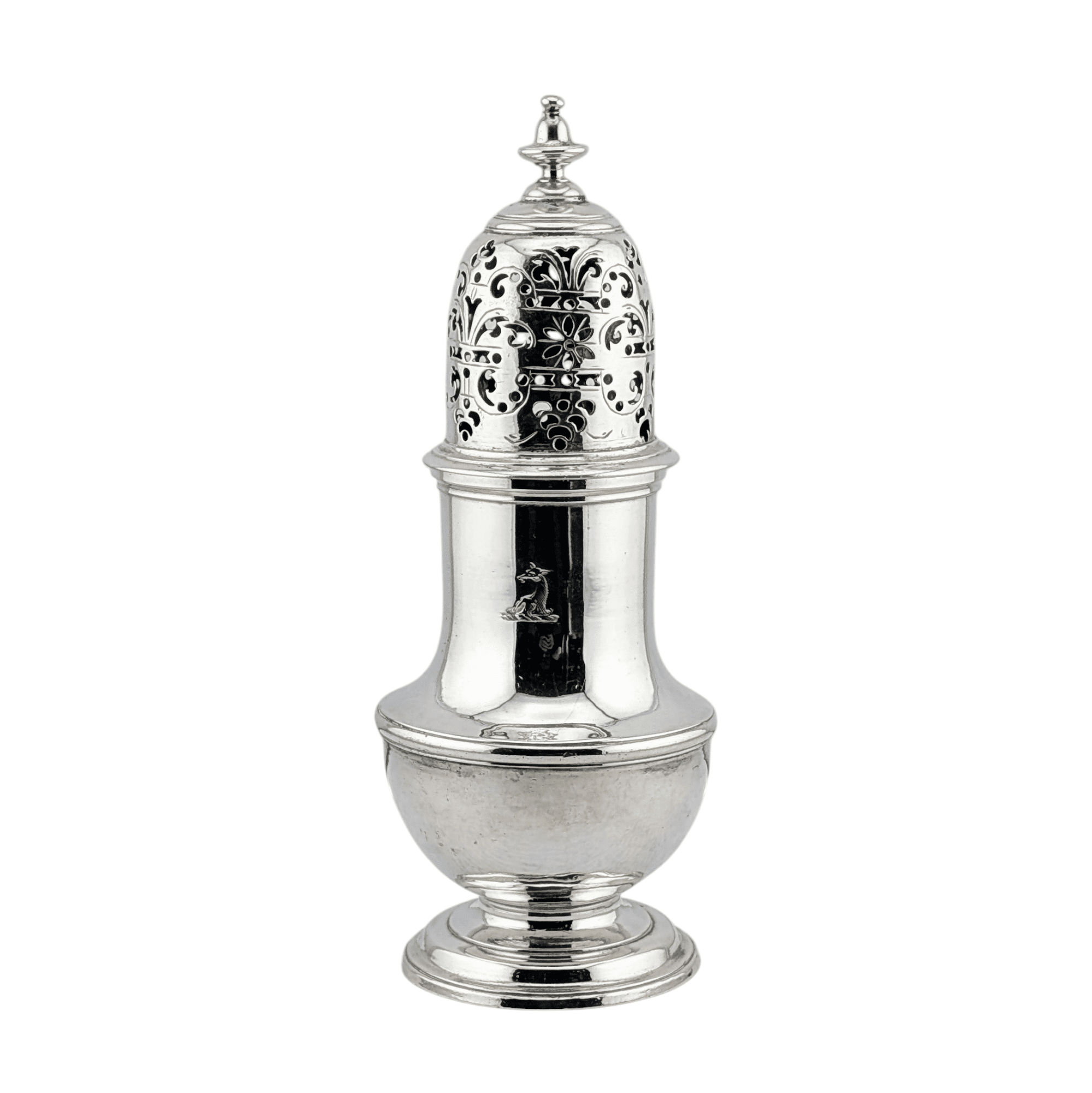 A very good early George II period sugar caster of baluster form, with a pull of lid which is beautifully hand pierced and is surmounted by a bell-shaped finial. The caster bears the original crest and underneath the foot are betrothal initials indicating, it was probably a wedding present for a couple that year. The caster was made in London in 1740 by the specialist caster maker Samuel Wood. The caster is in excellent condition with a pleasing patina. Dimensions, height 16 cm.