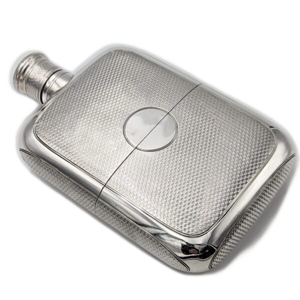 A rare antique silver hip flask, with engine turned decorationon on body and cup. With crisp hallmarks, and screw cap, this flask has a cartouche on the reverse, suitable for taking a personailsed engraving. Flasks pre 1900 are particularly unusual, and this is a fine example of Victorian craftsmanship. Hallmarked in 1869.