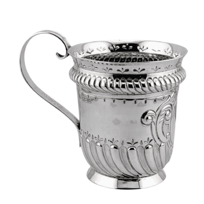 A charming Victorian Antique Silver Child’s Mug which features swirled half-fluting to the base and near the lip a border of fluting. The main body has a vacant cartouche. The mug has a scroll handle and sits on a pedestal foot