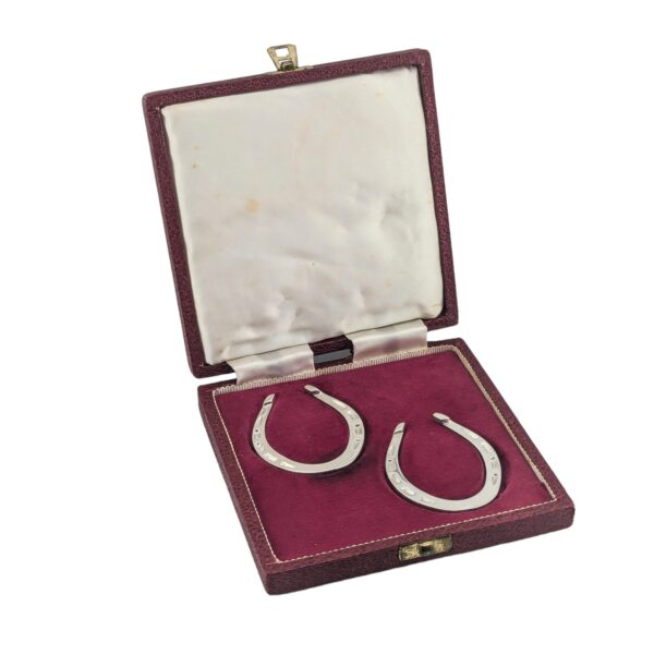 Quirky pair of sterling silver horse shoe napkin rings. Boxed. Hallmarked in Sheffield, 1972.