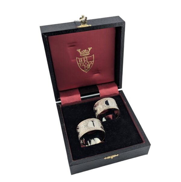 Pair of decorative napkin rings, hallmarked in Birmingham 1996. Black boxed.