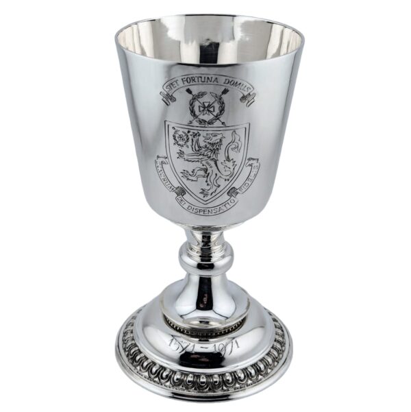 “Stet Fortuna Domus” (Let the Fortune of the House Stand) and “Donorum Dei Dispensatio Fidelis” (The Faithful Dispensation of the Gifts of God). The goblet was commissioned to to commemorate 400 years of Harrow School.