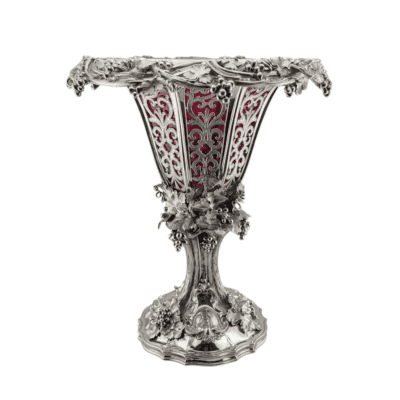 A large early Victorian centrepiece vase with a cranberry glass liner. This magnificent vase is beautifully decorated with trailing vine leaf decoration and very fine pierced and chased work. Vases of this early date are rare, especially one of this size and impressive weight. The condition is excellent.