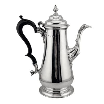 A fine George II sterling silver coffee, of a plain and gentle baluster shape onto a spreading foot. The pot has a finely cast and chased swan neck spout and a knopped finial. The underneath still bears the maker’s scratch weight of 25 troy oz 6 dwt , excluding handle. The coffee pot is in good condition throughout. The pot is made in 1754 by William Shaw and William Priest of London . Dimensions, height 24.75 cm. Weight, 26 troy oz.