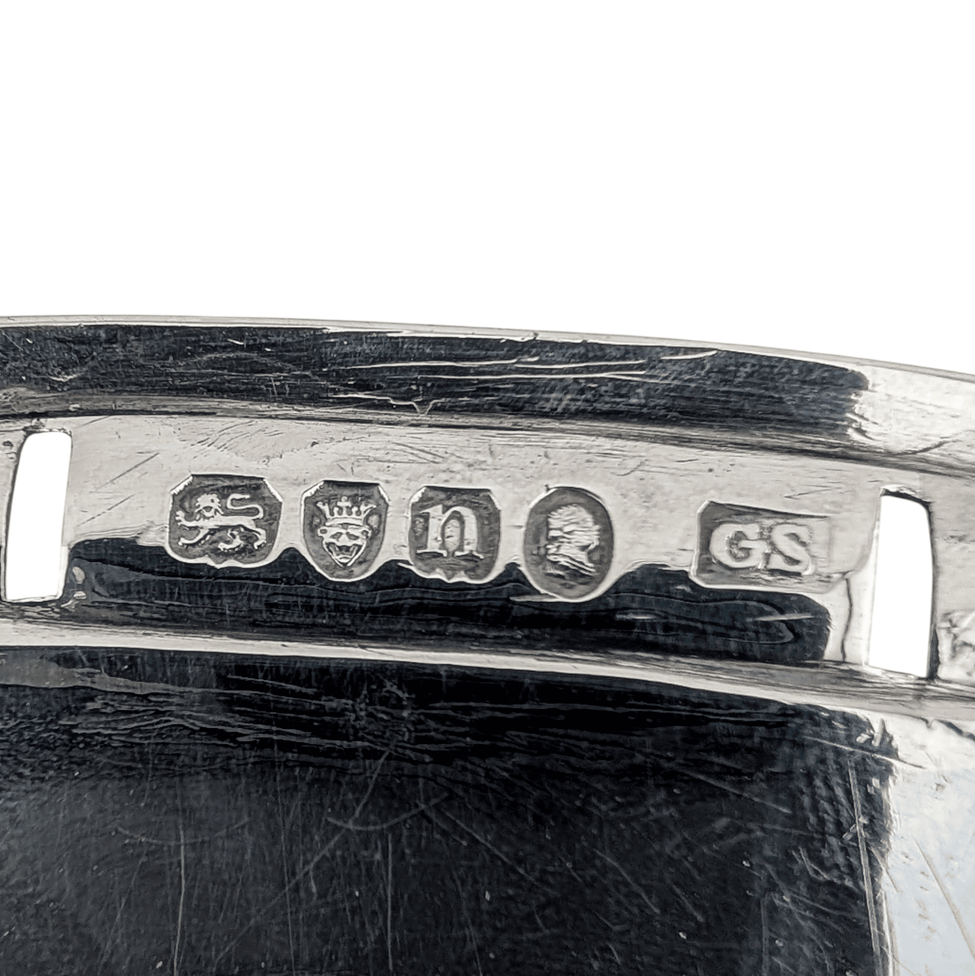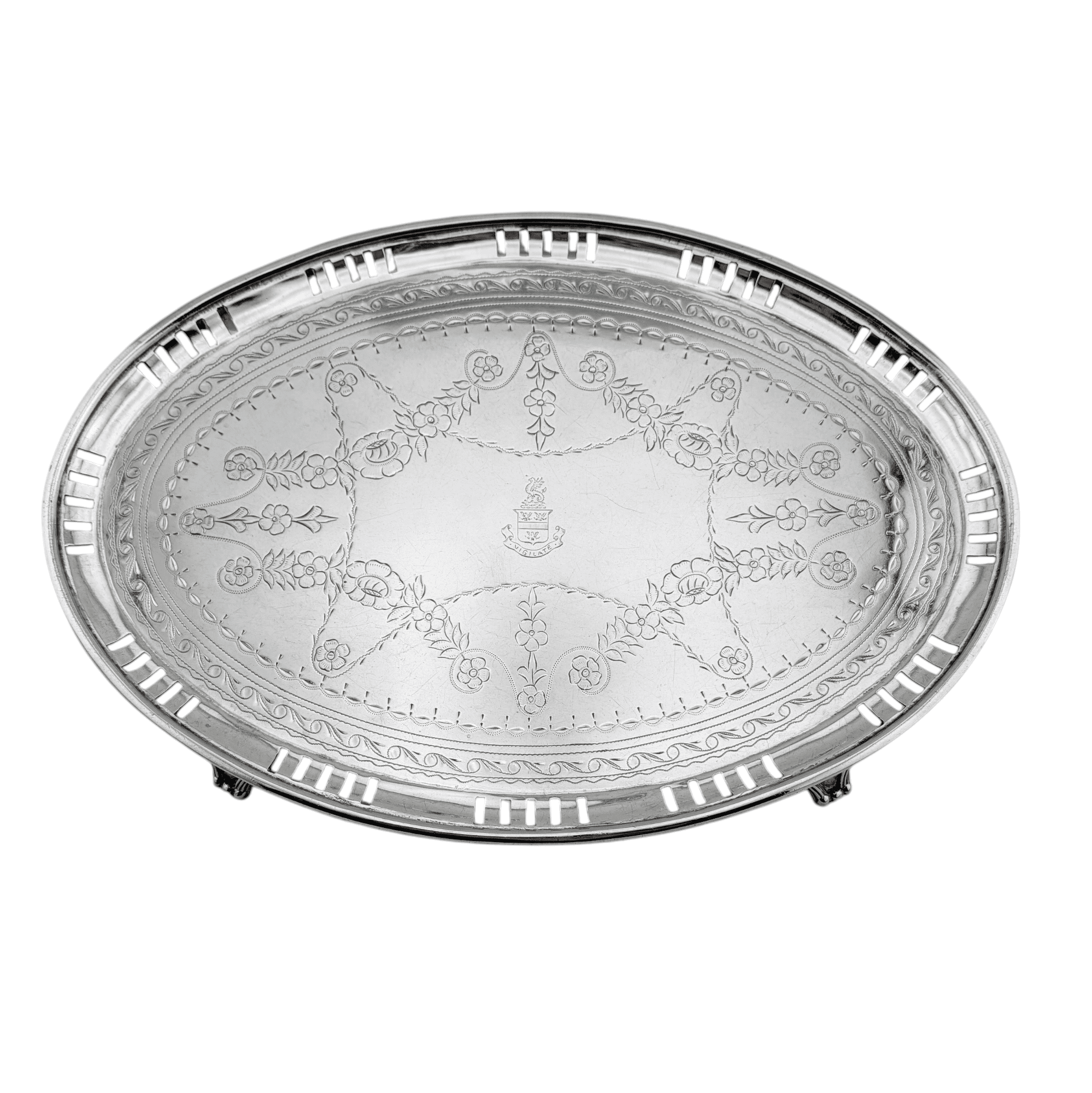 A very fine and unusual antique silver oval salver with a rare pierced border. The salver is very beautifully engraved with a family crest in the centre. The salver was made in the year Australia was founded.